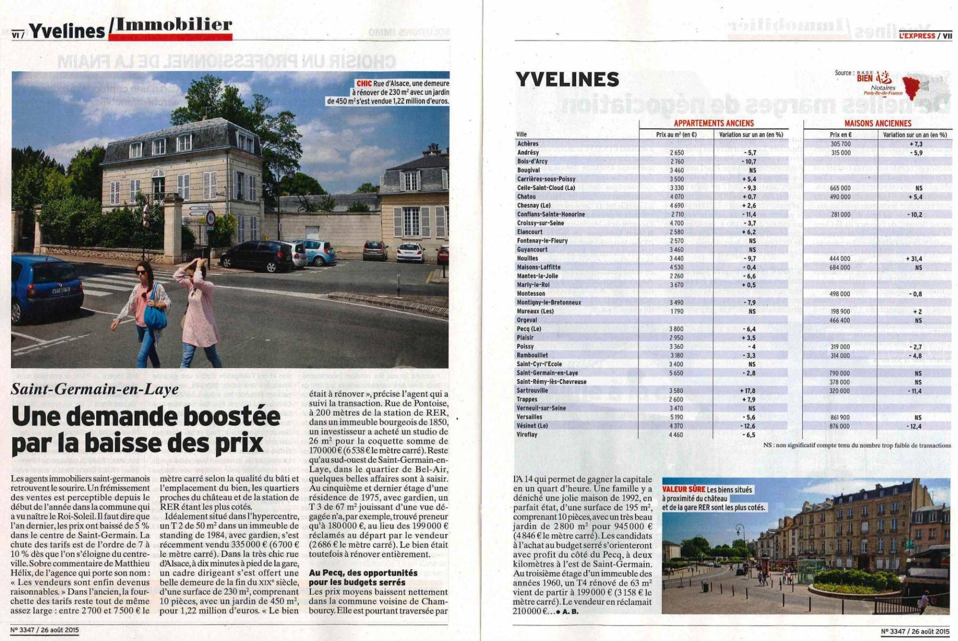 A chaque Rentrée son lot d'article sur l'immobilier, L'express du 26 Aout spécial Immobilier YVELINESs'interesse au marché de l'immobilier à Saint Germain en Laye. Helix Immobilier apparait en seul référence sur le secteur pour l'article du magazine.