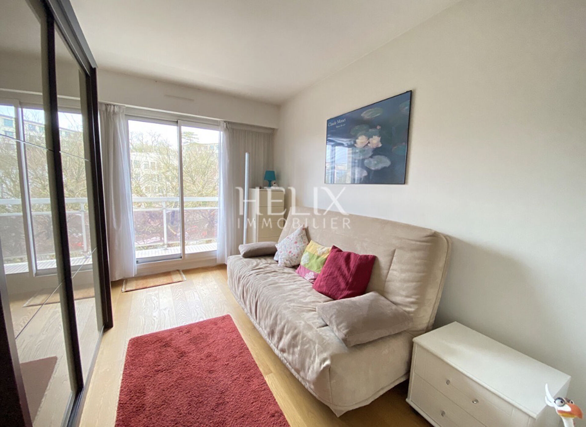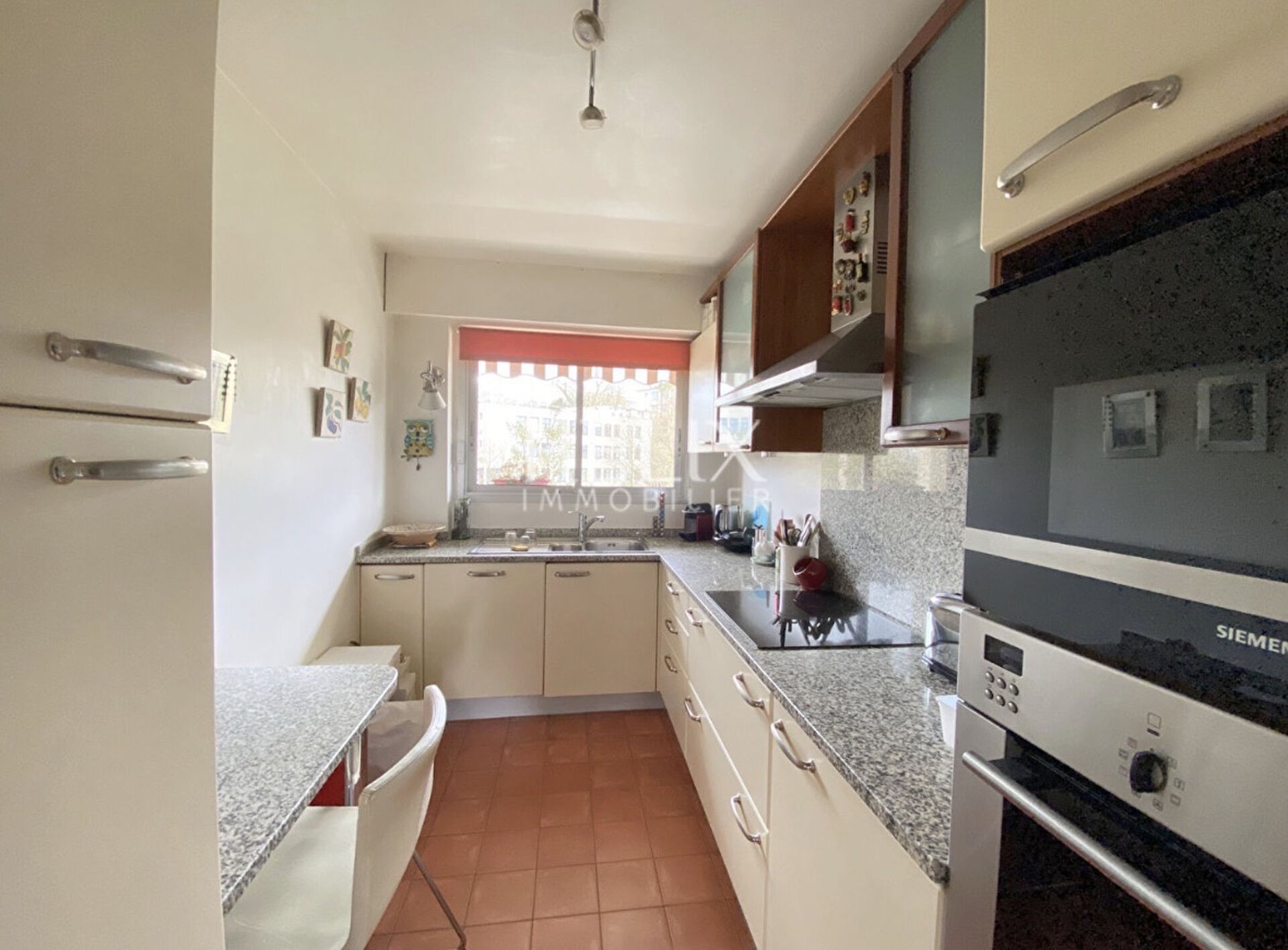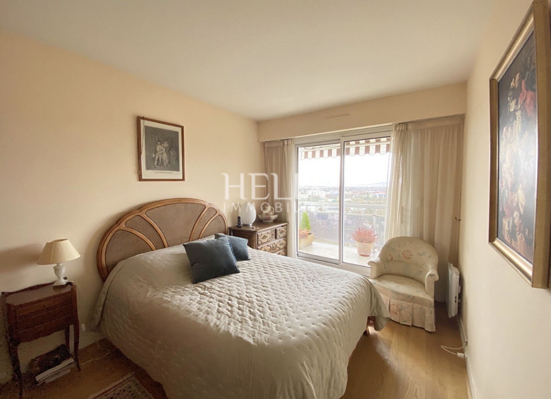 L'entrée dessert un vaste double séjour bénéficiant d'une belle luminosité et prolongé par un grand balcon avec une vue dégagée sur Paris et La Défense. La cuisine, indépendante, est aménagée fonctionnelle, offrant un espace agréable au quotidien.