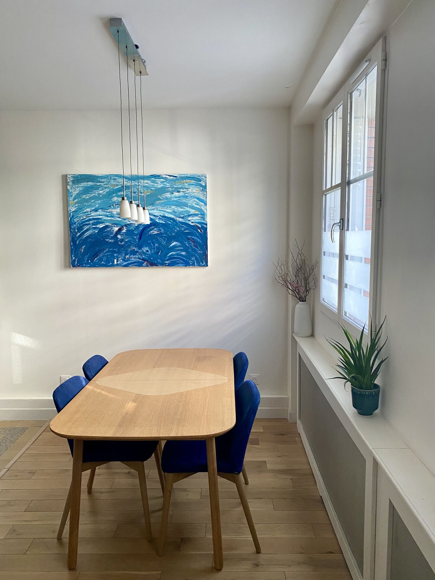 l'appartement se compose d'un vaste double séjour traversant baigné de lumière grâce à sa double exposition, cet espace de réception décoré avec une élégance sobre, invite à la sérénité. La cuisine, véritable signature moderne, s'ouvre le salon, avec un équipement complet et parfaitement intégré.