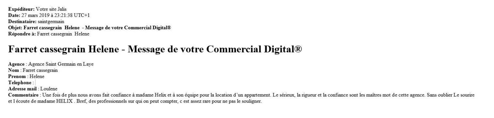 Bonjour. Je souhaiterais avoir de plus amples informations concernant : Temoignage client Helix Immobilier: Une fois de plus nous avons fait confiance à madame Helix et à son équipe pour la location d’un appartement. Pourriez-vous me recontacter s'il vous plait ?